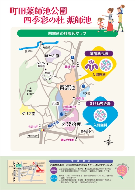 花しょうぶやあじさいが咲き誇る町田薬師池公園四季彩の杜で、「しょうぶ・あじさいまつり」を開催します。開催期間中には、まちだ観光案内人によるガイドや、早乙女姿の花摘み娘による花しょうぶの手入れなどを行います。
