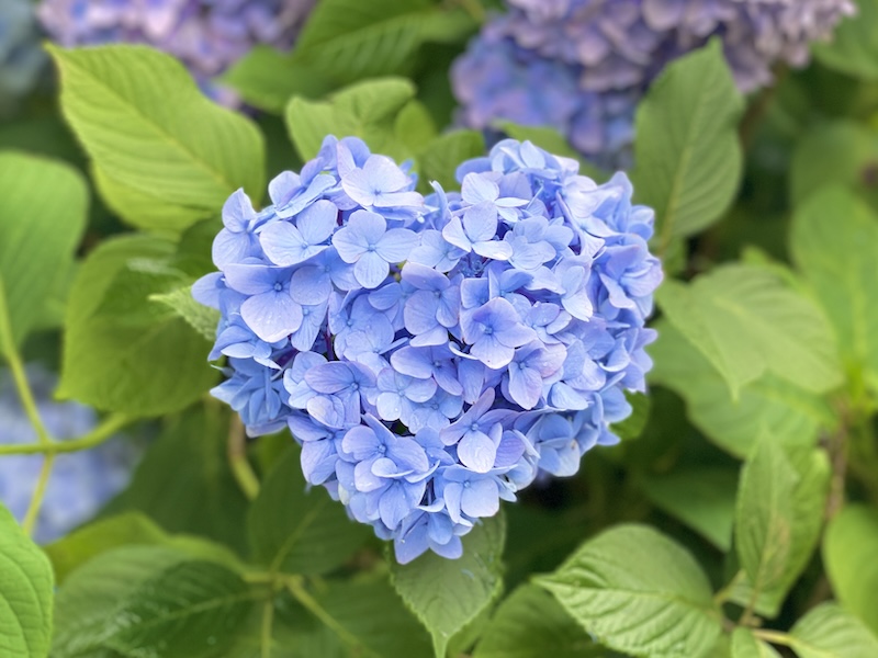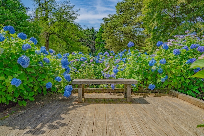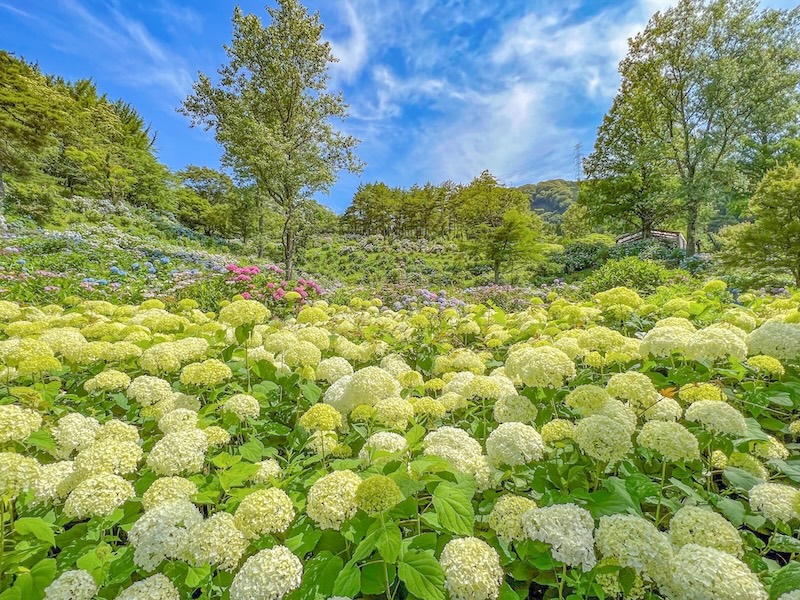 例年、梅雨の雨露を受けて一層輝きを増すアジサイは、⻘、紫、ピンク、白と、多様な色合いで見る人の目を楽しませます。一面にアジサイが咲き誇る景色は圧巻で、まるで絵画のような幻想的な空間が広がります。
