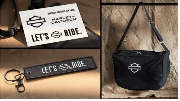 期間中にご来店の皆さまへ、ヘルメットやスマホのカスタムも映える『ハーレーダビッドソン ロゴクリアステッカー』(写真左上)をもれなく差し上げるのに加え、ご試乗またはお見積のお客様には『オリジナルフライトタグ』(写真左下)も合わせてプレゼントいたします。また期間中にご成約いただいた先着150 名様には『ロゴ入りヘルメットバッグ』(写真下)も進呈します*1。