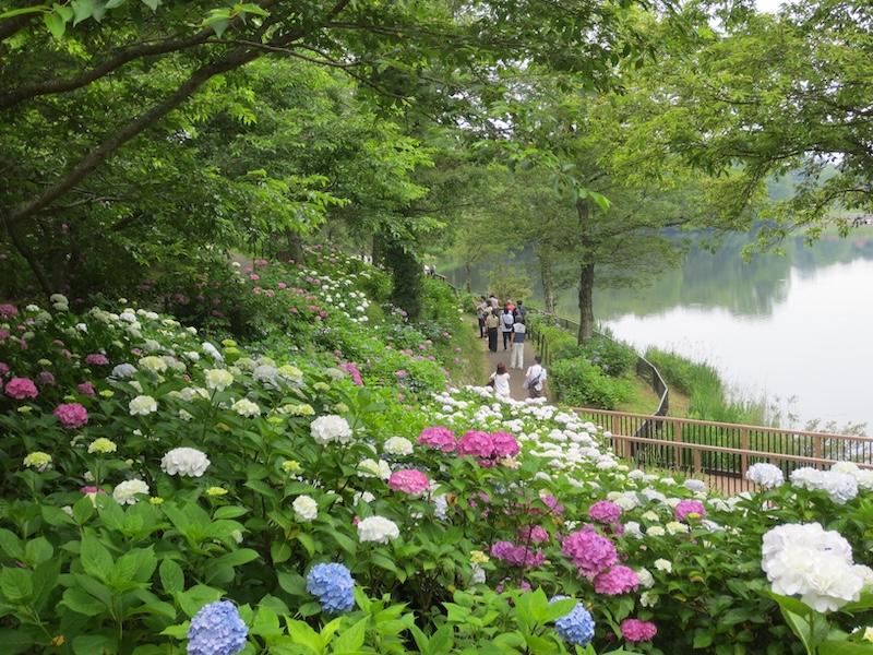 まんのう公園のあじさい苑は「飛竜池(ひりゅういけ)」というため池に隣接しており、水辺と新緑との美しいコラボレーションをお楽しみいただけます。