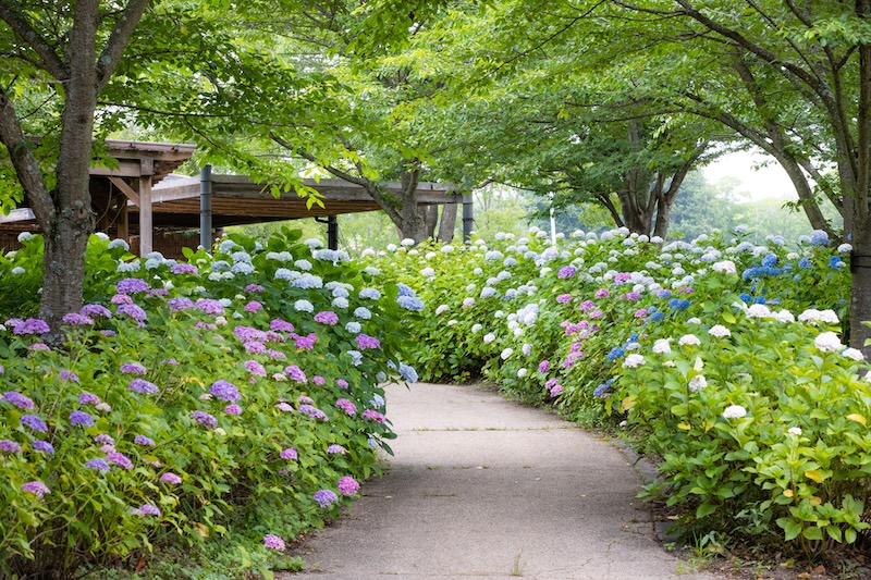 まんのう公園には約40品種のアジサイが植栽されており、様々な花の色や形をお楽しみいただけます。