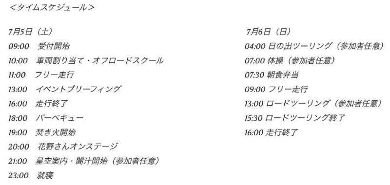 ●参加費:¥20,000/1名(税込)(コース使用料2日分/キャンプ場利用料/三笠の湯入浴/バーベキュー&朝食弁当/レンタル車両/EXPLORER PARKフェイスタオル/ネックチューブ)