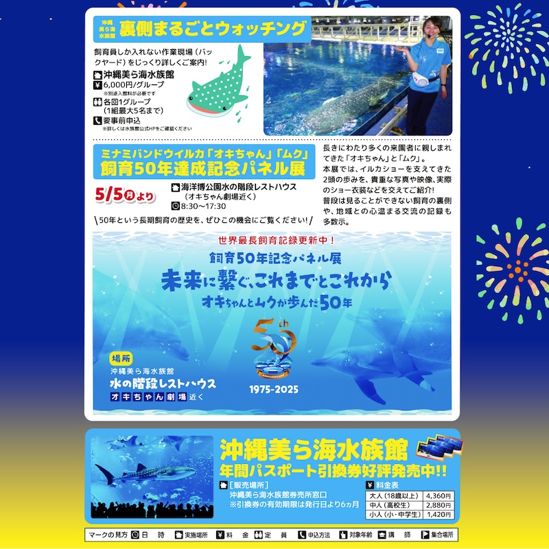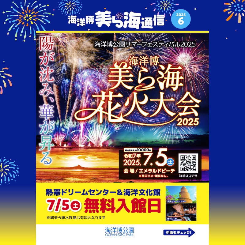 海洋博公園では、園内の最新情報やイベント情報をお届けする広報誌『美ら海通信』2025年6月号を発行いたしました。本号では、美ら海花火大会・ミナミバンドウイルカ「オキちゃん」「ムク」飼育50年達成記念パネル展・ゆるふわイラストレーター「みいるか」さん特別イベントなど多彩なプログラムを紹介しております。