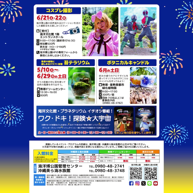 そのほか、苔テラリウム体験や水族館の裏側まるごとウォッチングなど、梅雨の時期でも楽しめる屋内イベントが充実!この機会にぜひ、家族みんなで海洋博公園へお越しください!