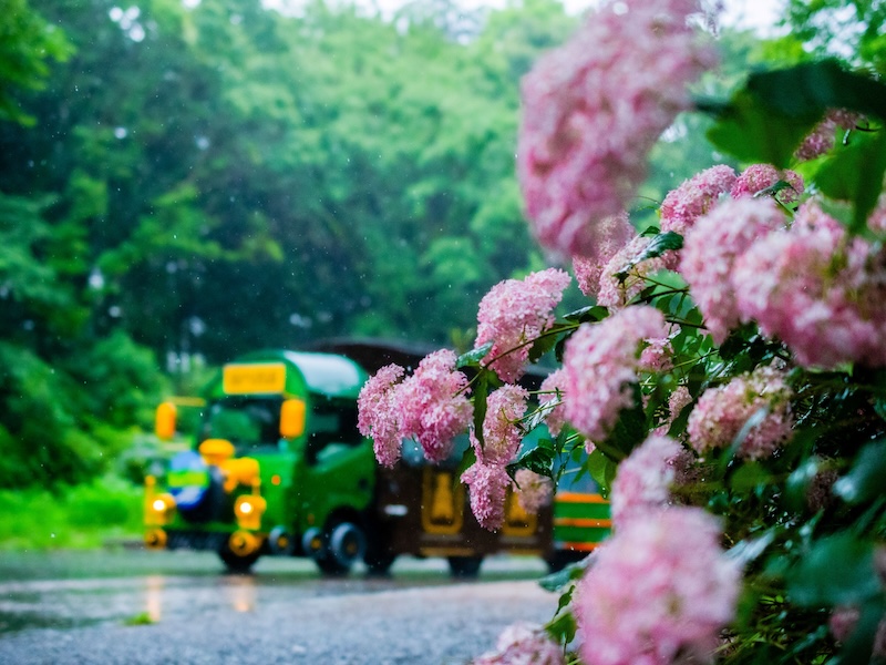 しっとりとした梅雨の趣を感じる季節へと移り変わってきました。そんな梅雨を代表する花といえばアジサイ。園内には色とりどりに咲くアジサイと、一緒に写真が撮れるフォトスポットをご用意しています。無料貸し出しのアジサイ傘を片手に、ゆったりとした時間をお楽しみください。静かに咲くアジサイが、雨の日のおさんぽを特別な時間に変えてくれます。