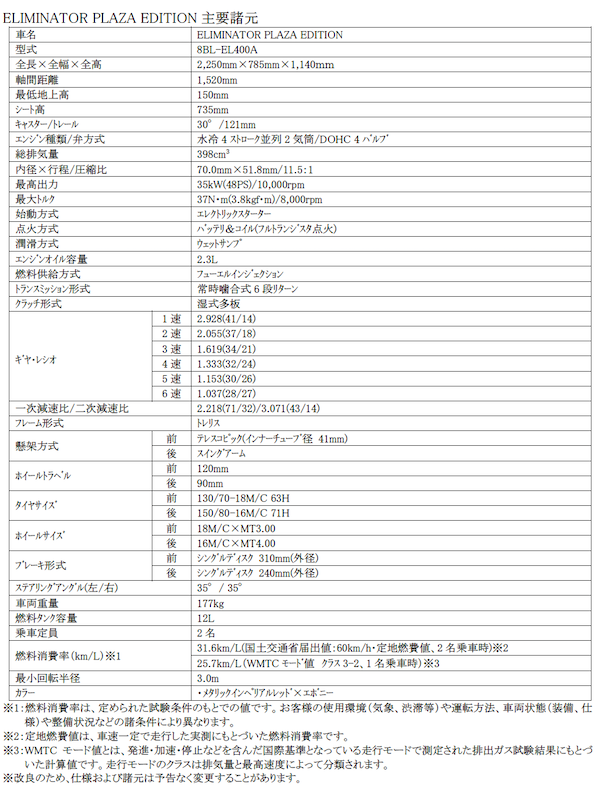 このたびカワサキプラザ専用モデルとして、「ELIMINATOR PLAZA EDITION」が登場です。