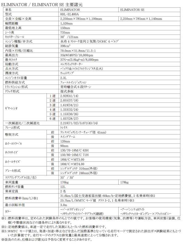 | メーカー希望小売価格 | ・ELIMINATOR 858,000円(本体価格 780,000円、消費税 78,000円)・ELIMINATOR SE 957,000円(本体価格 870,000円、消費税 87,000円) |