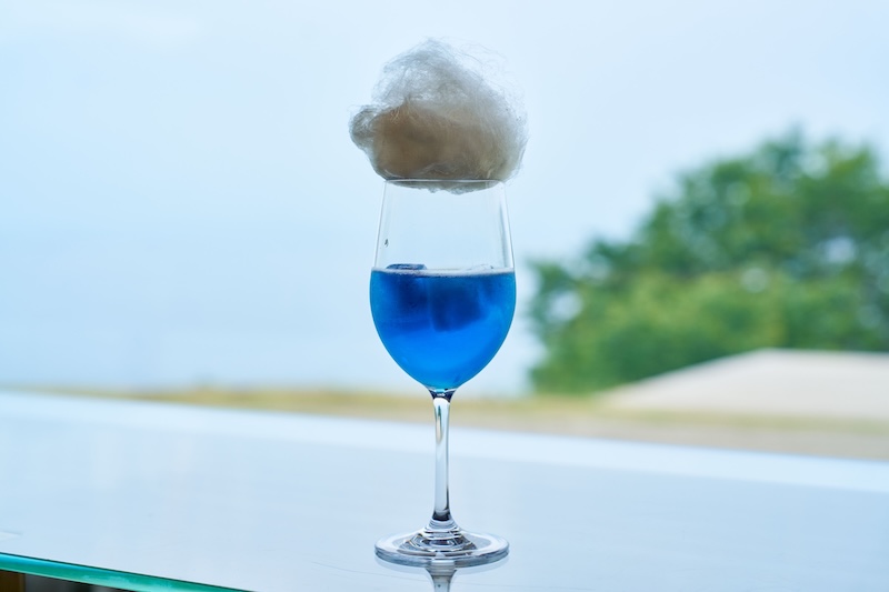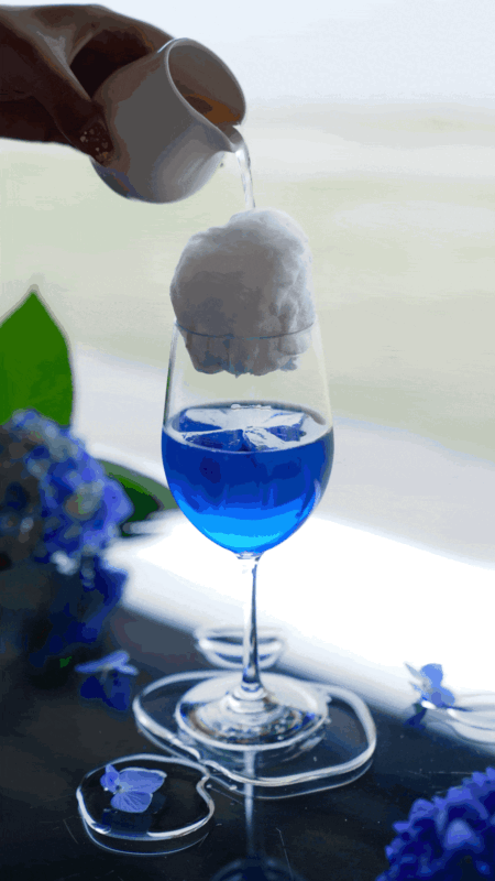 詳細:グラスの上に、まるで雨空に浮かぶ雲のようなふわもこのわたあめをトッピング。このわたあめに上からエルダーフラワーのシロップを注ぐことで、グラス内のバタフライピーのハーブティーが青から赤へとゆっくり色が変化します。紫陽花を思わせる美しい色のグラデーションをお楽しみください。