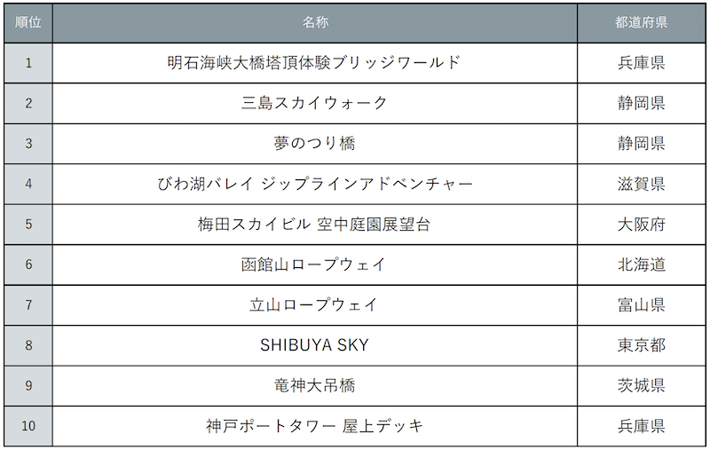 ■湖にかかるつり橋や、山を臨むロープウェイから、都心の展望台まで幅広いスポットがランクイン