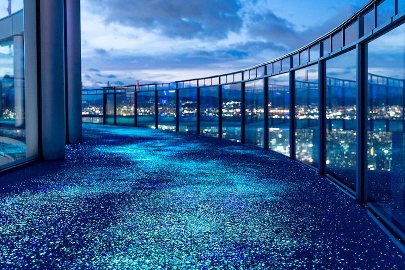 高さ173mを誇る「梅田スカイビル」。「空中庭園展望台」からは、街並みはもちろん大阪平野や六甲山系をはじめ、晴れた日には遠くの淡路島まで一望できます。大阪港に沈む夕日や、日没後には足元が天の川のようにきらびやかに輝く様子など、訪れる時間によって変化するさまざまな景色を1周しながら堪能できます。