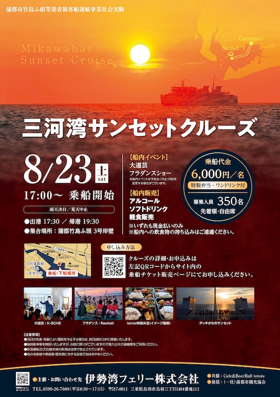 蒲郡竹島埠頭発着『三河湾サンセットクルーズ』を運航いたします。
