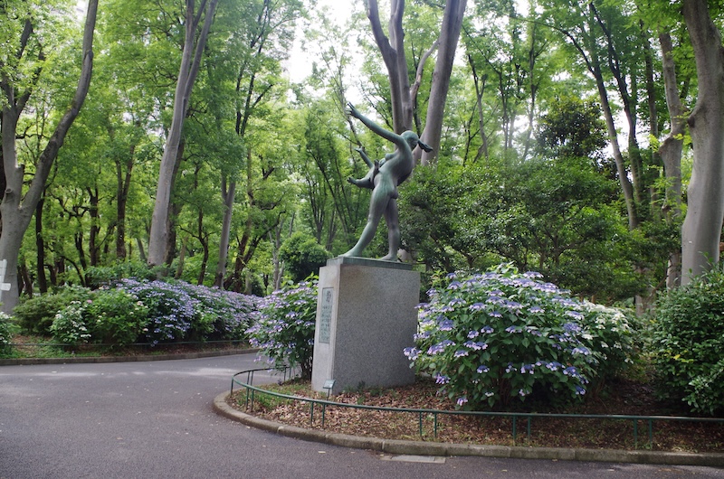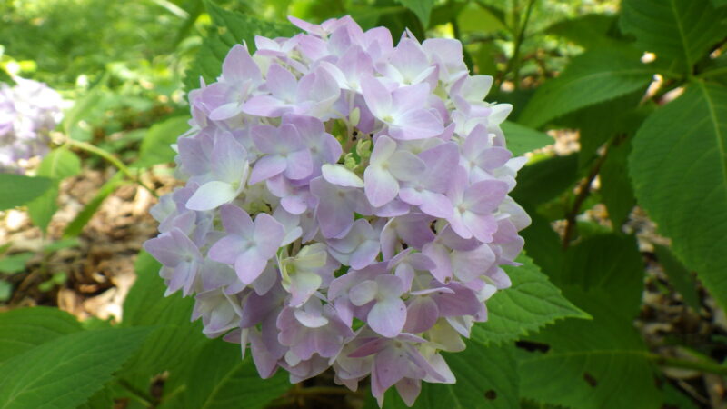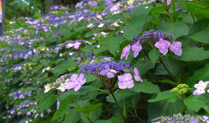 6月 アジサイが紫や水色、ピンクに色づき、晴れの日も雨の日も公園を彩ります。