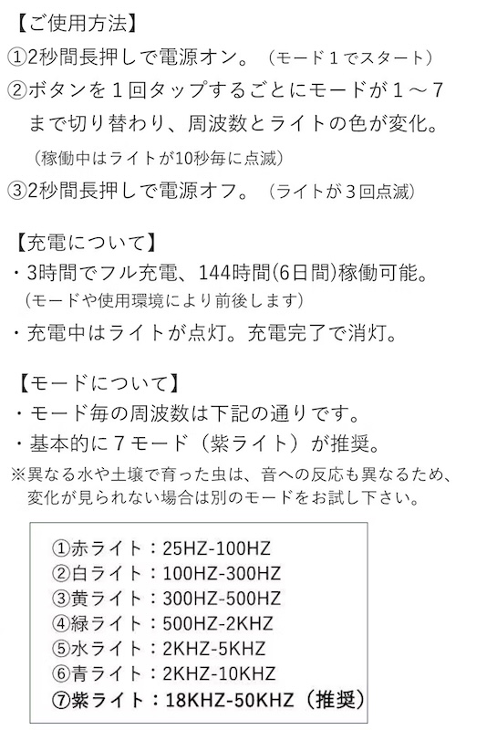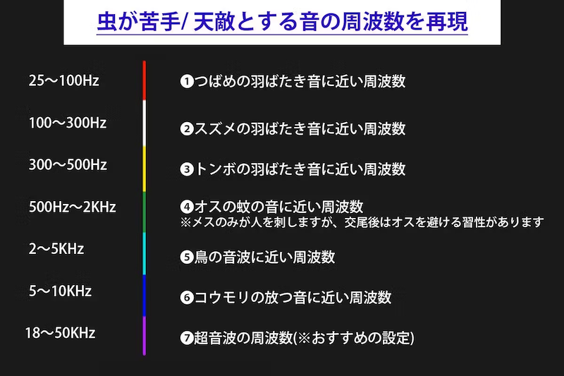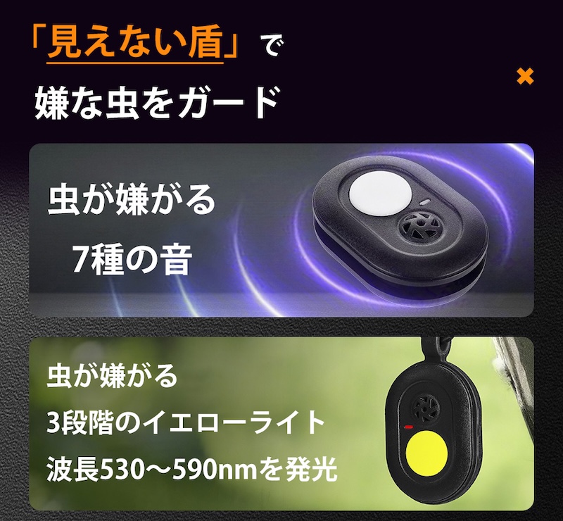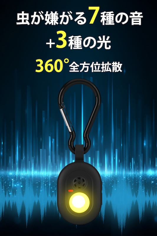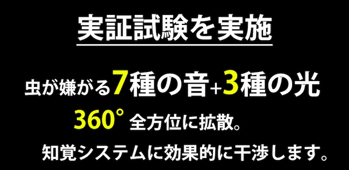 ①虫が嫌がる7種類の音に、3種の光をプラス。360度全方位に広がる、頼れる虫除けバリア。