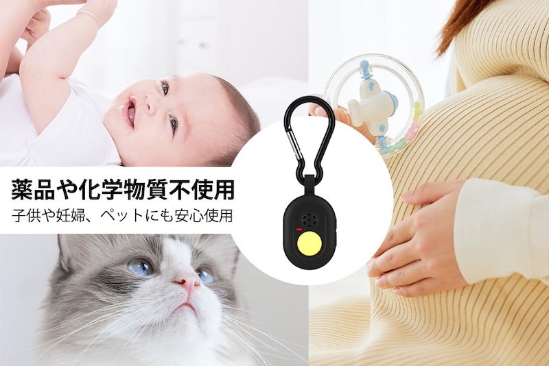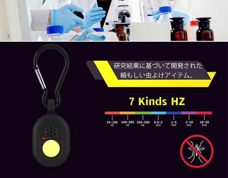 MINI REPELⅡは、蚊が嫌がる7種類の音波を360度全方位に拡散し、不快な音で虫の接近をブロックします。人間の耳にはほとんど聞こえないほど微弱ですが、虫にとってはしっかりとした刺激になります。
