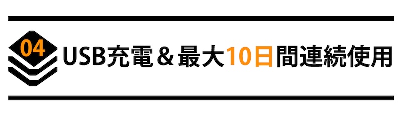 USB経由で手軽に充電でき、フル充電でなんと最大10日間連続使用が可能! つけっぱなしでもOKなので、寝る前に毎回スイッチを気にする必要もなし。 アウトドアでも日常でも、充電切れの心配をせずに安心して使えます。