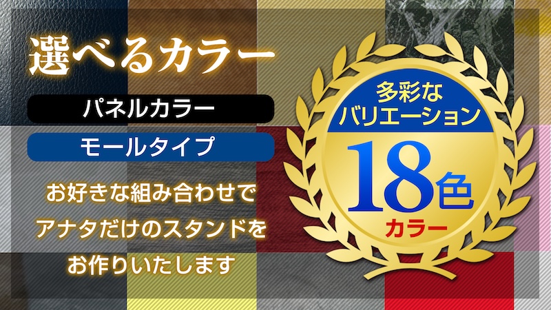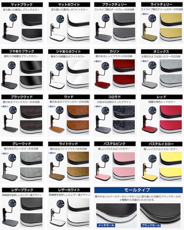 パネルカラーは18色もの豊富なバリエーションをご用意。モールタイプはメッキ、ブラックの2種類からお選びいただけます。