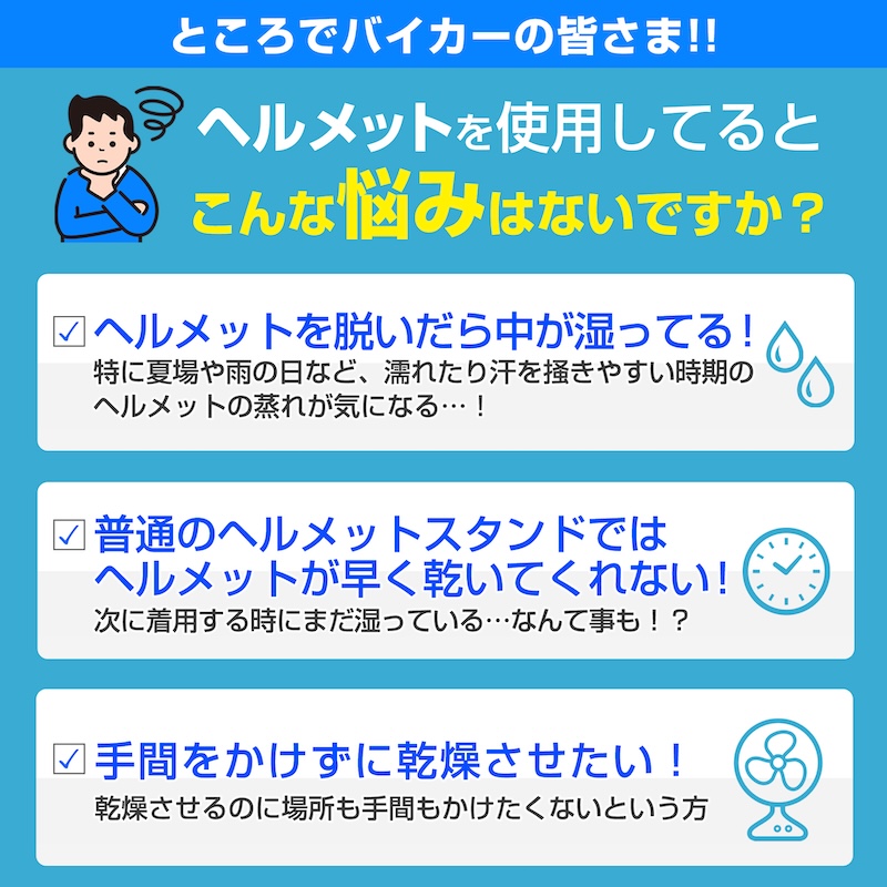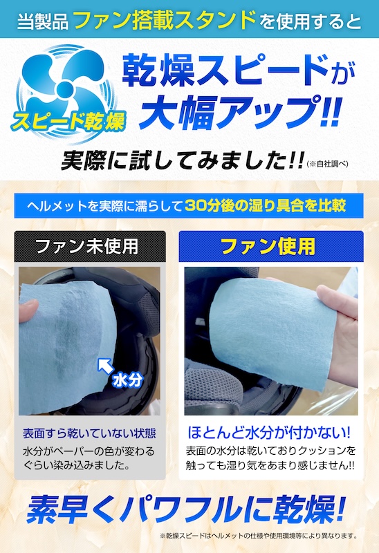 との思いで生まれたのが乾燥ファン搭載ヘルメットスタンドです。