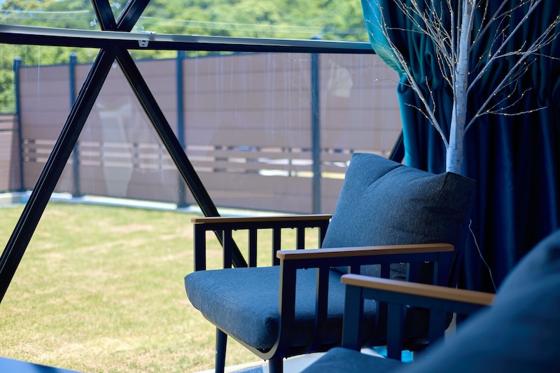 オーシャンドームではサウナや水風呂に入りながら、遠くに広がる青い海と空を自分たちだけのプライベートガーデンから楽しむことができます。ドーム直結のバスルームやトイレを完備しているため、天候を気にすることなく安心してグランピングをお楽しみいただけます。