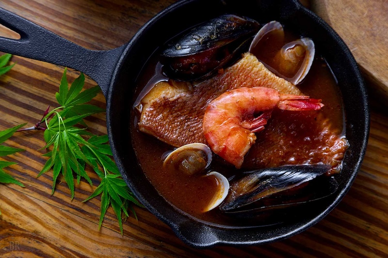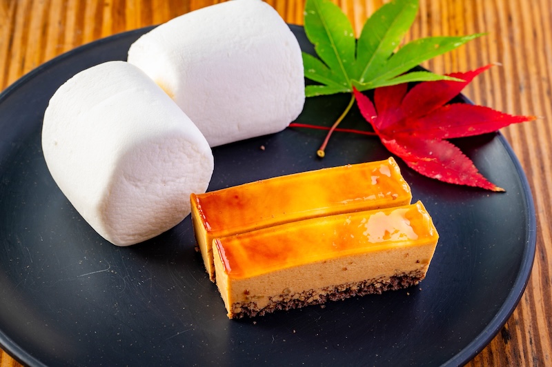 | 本日のスキレット1種・赤魚のブイヤベース・ムール貝のアクアパッツァetc | 本日のデザート・焦がしキャラメルケーキetc焚火を楽しむ特大マシュマロ |