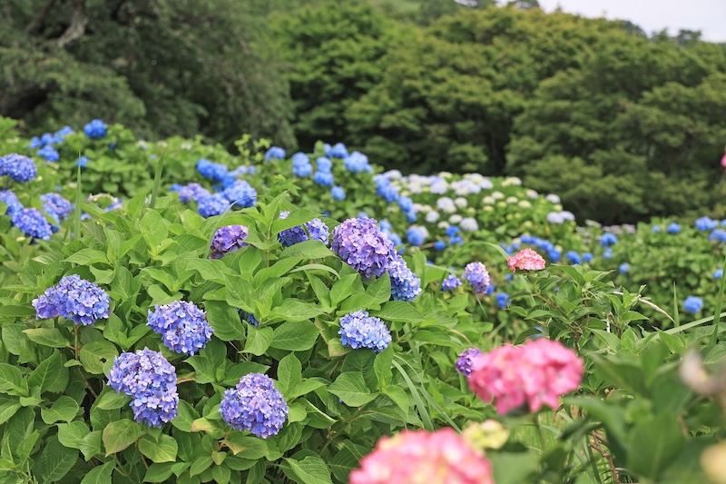 あじさいが最も群生しているメインエリアの「あじさい園」や、まきばエリアとあじさい園をつなぐ約500mにわたる遊歩道沿いであじさい鑑賞をお楽しみいただけます。