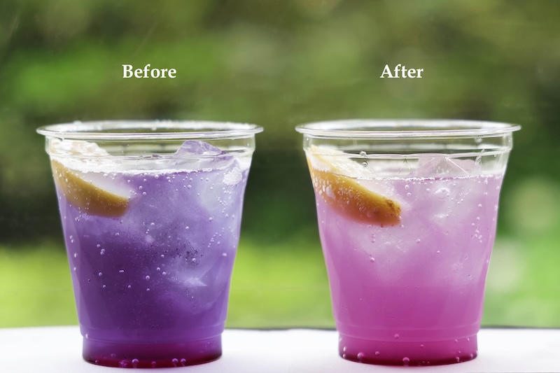 「あじさいレモネード」は、ご提供時は青紫色でレモネードベースを入れ酸性になることで赤紫色になるので、あじさいの反応とは逆ですが、