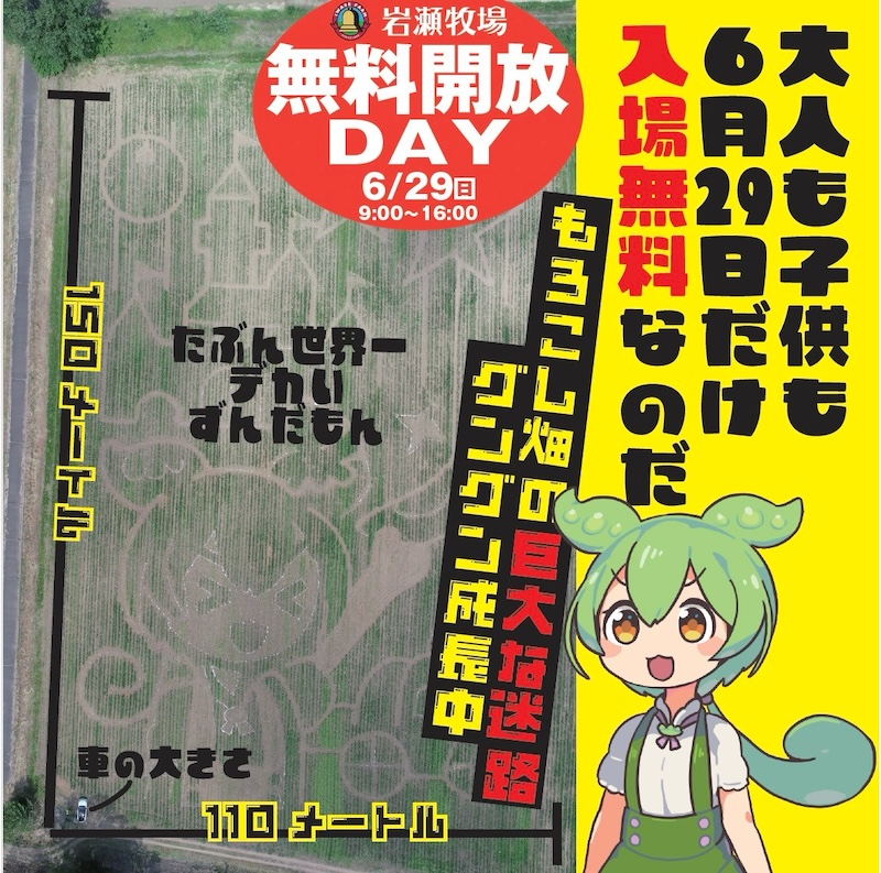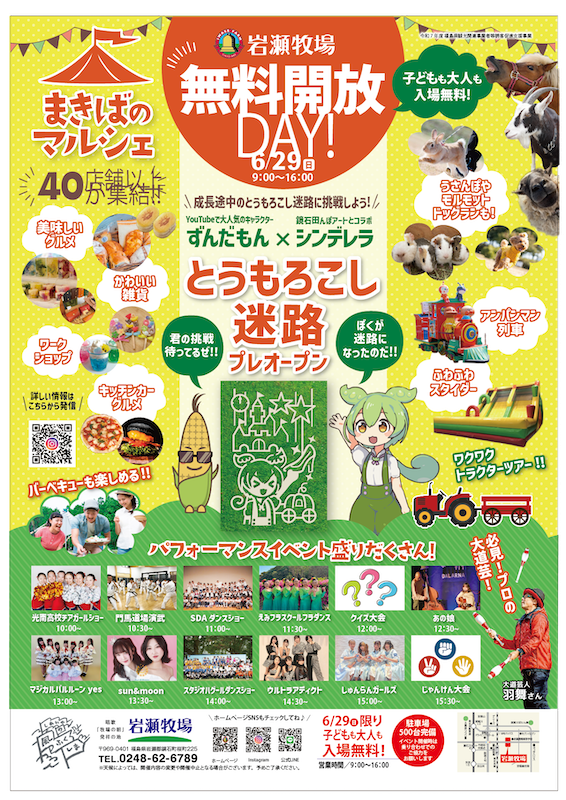 岩瀬牧場では、例年夏に「とうもろこし巨大迷路」を行っており、本年度、YouTube やニコニコ動画などでも大人気のキャラクター「東北ずんだもん」とコラボを行い、キャラクターの地上絵になるという新たな取り組みを始めます。そこで成長途中の迷路を見てもらおうと、プレDC の期間である6月29日(日)に、牧場の入場料やとうもろこし迷路の参加料を無料にするほか、「まきばのマルシェ」と題し、グルメや雑貨など、40 店舗以上が集まり、クイズや大道芸、ダンスに音楽といった多彩なステージパフォーマンスもあり、盛りだくさんの内容となっております。