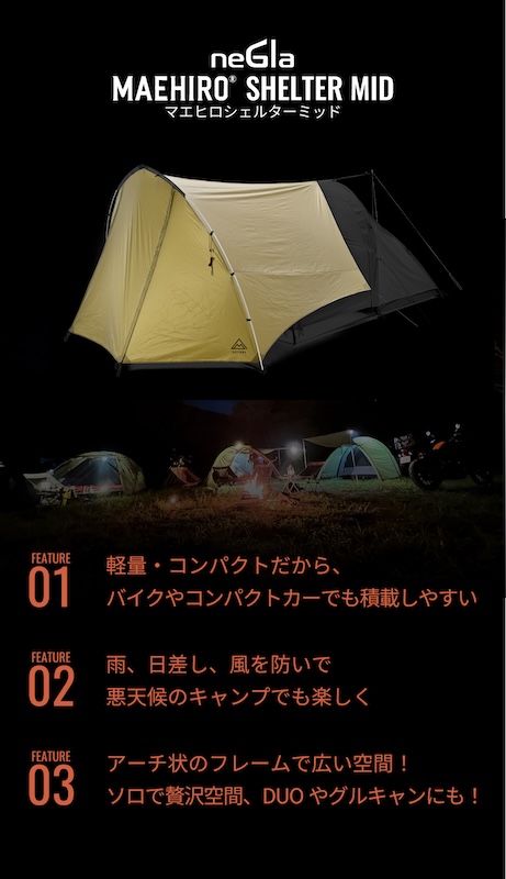 コンパクトなテントで室内空間が制約されてしまい不便な思いをされているライダー達にもっとキャンプを楽しんで欲しい!そんな思いから生まれたのが『マエヒロシェルター』です。