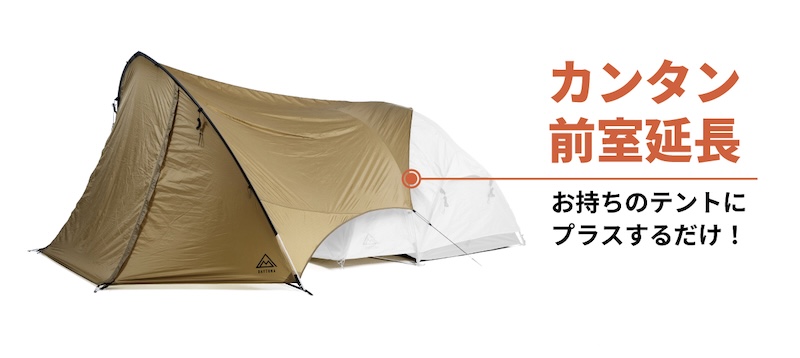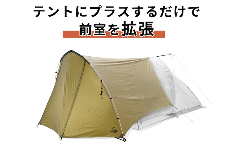 デイトナのテントにジャストフィット。お手持ちのテントに後付けするだけで大型の前室が出現。単独での使用も可能。軽量コンパクトな設計で荷物を増やしたくないツーリングキャンパーにおすすめなシェルターです