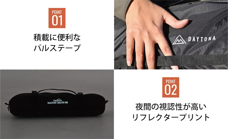 収納袋には夜間の視認性に優れたリフレクタープリント付きです。