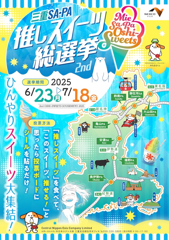 中日本エクシス株式会社 三重支店は、三重県内のサービスエリア(SA)パーキングエリア(PA)の店舗(一部除く)において、一昨年大好評であった、自慢のスイーツを競い合いNo.1を決定する“三重SA・PA推しスイーツ総選挙 ひんやりスイーツ大集結!”を開催します。