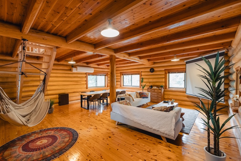 | 1階 | ・大画面プロジェクター (動画配信サービス)・吊り下げハンモック・テントサウナ(追加オプション)・ダイニングテーブル・湯沸かしポット・冷蔵庫(冷凍庫付き)・お手洗い・洗面台・浴室・エアコン・ゴミ箱 |