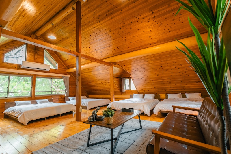 | 2階 | ・ベッド4台(クイーンベッド2台+ダブルベッド2台)・キッチン・冷蔵庫(冷凍庫付き)・調理器具(鍋、フライパン)・食器類・お手洗い・洗面台・エアコン |