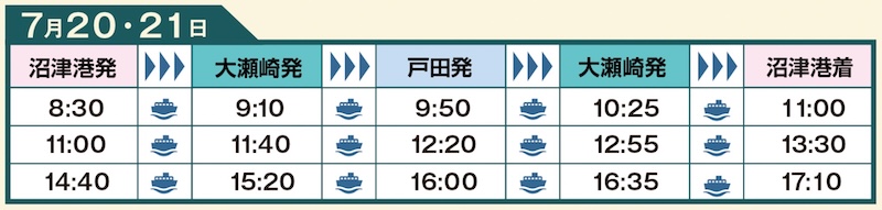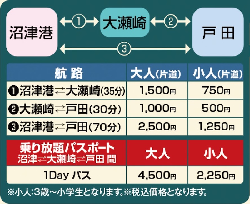 | 運賃 | 〈乗船運賃(片道)〉①沼津港 ~ 大瀬崎(約35分) 大人:1,500円 小人:750円②大瀬崎 ~ 戸田 (約30分) 大人:1,000円 小人:500円③沼津港 ~ 戸田 (約70分) 大人:2,500円 小人:1,250円※上記料金は片道料金です※小人:3歳~小学生※税込価格となります〈1Dayパスポート(乗り放題)〉沼津港 ⇔ 大瀬崎 ⇔ 戸田 乗り放題 大人:4,500円 小人:2,250円※税込価格となります※小人:3歳~小学生 |