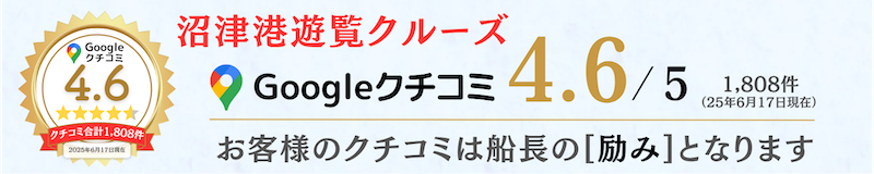 沼津港遊覧クルーズは、Googleのクチコミで1,808件中4.6/5点という高評価をいただいております。