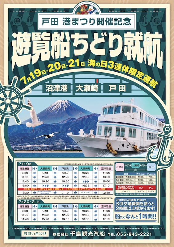 ~2年連続大変ご好評いただいております人気企画、千鳥観光汽船が「沼津港」「大瀬崎」「戸田(へだ)」の3か所を巡る特別クルーズ便を2025年海の日3連休(7月19日・20日・21日)に運航します~