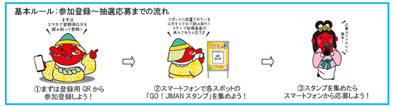 西日本各地の全102スポットに設置された「GO!JIMANスタンプ」を集めて応募しよう!