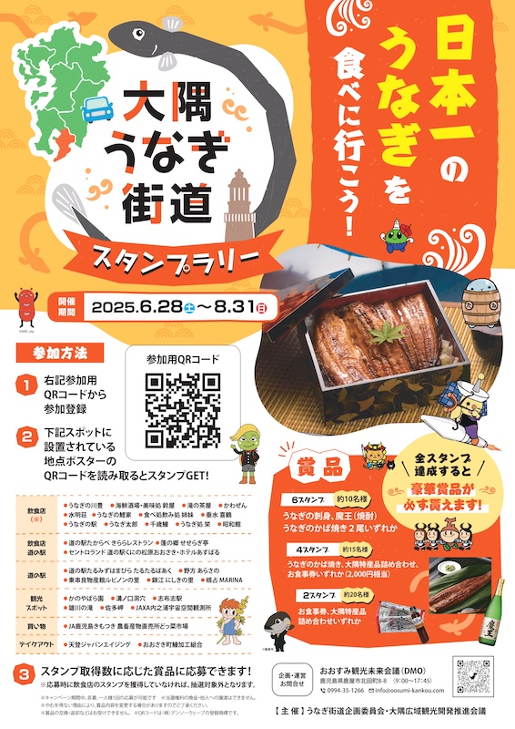 期間中、うなぎの名店や観光スポット、道の駅を巡りポイントを獲得!ゲーム感覚で楽しめるデジタルスタンプラリー、新たに開設するInstagram「大隅うなぎ街道」をフォローするだけで賞品が当たるフォローキャンペーンに参加していただくと抽選でうなぎの刺身や蒲焼、大隅特産品をプレゼントいたします。