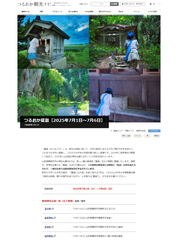 期間中のご参拝をより楽しんでいただけるよう、参加神社仏閣を巡るモデルコースを山形県鶴岡市の観光情報サイト「つるおか観光ナビ」に掲載しています。