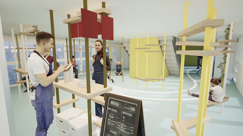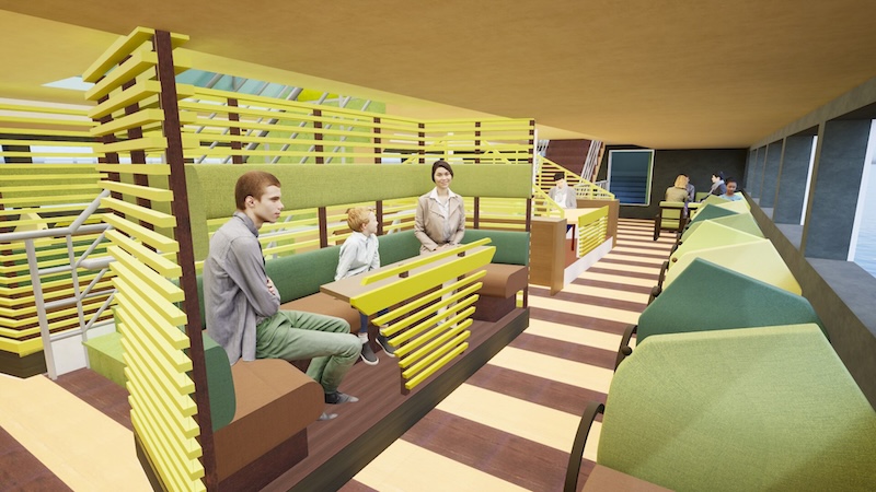 2階遊歩デッキと3階デッキは、初島に通じる自然やアソビを詰め込んだワクワクするエリアです。2階の遊歩デッキは、竹馬風ベンチのほか床面にレールアートが施された公園のような空間です。また、お子さまの目線に合わせて設計された大きな窓からダイナミックな海の景色をお楽しみいただけます。3階デッキは人工芝生の広場が広がります。