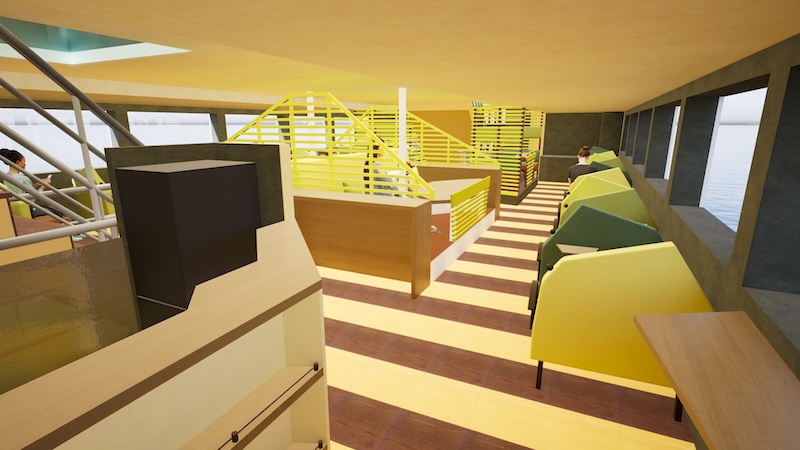 全4階(地階~3階)からなる船内で、最も特別なのが1階前方に位置する「特別室:金富士」です。ソファを備えたプライベート客室からは、大きな窓越しに大海原を一望でき、初島から熱海港への航海中には富士山を見ることもできます。2階の遊歩デッキは竹馬風ベンチがある公園のような空間で、お子さまの目線に合わせて設計された大きな窓からダイナミックな海の景色をお楽しみいただけます。そのほか人工芝の広場や富士山型の背もたれを備えたボックスシートで波しぶきを間近に感じたり、半個室風スペースでご家族とゆったりとお過ごしいただくこともできます。全てのフロアを巡りながら、遊び心満載のワクワク感をご体感いただける新船ですので、シーンに合わせて思い思いのお時間をお楽しみください。