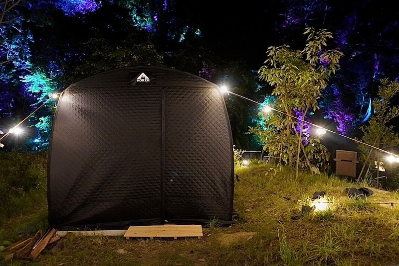 「森のふもとのサウナ」は、自然との一体感を感じる事のできる、テントサウナを採用し、薪を使用したストーブとロウリュウによる蒸気で、香りからサウナをお楽しみいただけます。日中は森に抱かれているかのような不思議な“ととのい”、夜は「チームラボ」のアート作品に包まれながら幻想的な“ととのい”を体感でき、昼夜で“ととのい”の世界が変わります。