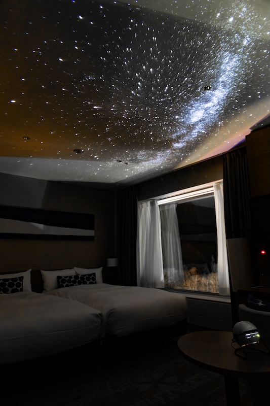 最上階角部屋にあるスーペリアコーナーツインは大きな窓が特長の開放的な空間。備え付けのホームプラネタリウムで、煌めく星空を天井に映し出し、非日常的な時間をお過ごしいただけます。