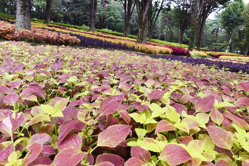 シソ科の植物で、品種によって多彩な葉色を楽しむことができる人気の高いカラーリーフです。当園では約2,000㎡の「こもれび花畑」で、約1.3万株を育てています。10品種を用いたダイナミックな放射線状のデザインとなっており、写真撮影にもおすすめの人気スポット。丈夫で鑑賞期間が長く、夏から秋にかけて見頃が続きます。