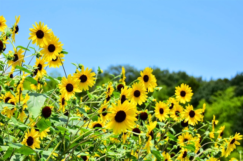 当園では、小型・多輪咲きのヒマワリ ”サンフィニティ”を育てています。今年は、ゆるやかな丘になっている「公園・庭園樹園」で約500株の花畑をご覧いただけます。