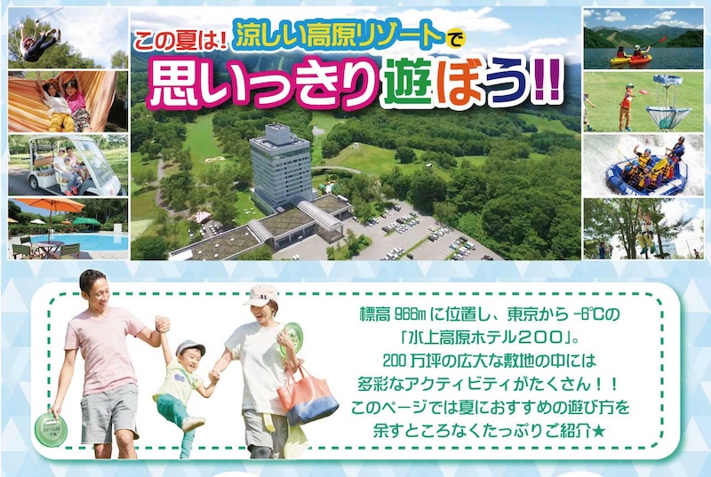 一昨年あたりから「日中は暑すぎて、外で遊ぶ子どもが減っている」というニュースを目にするようになってきました。水上高原リゾート(株)の運営する「水上高原リゾート200」は、群馬県北部、みなかみ町の中でも標高が高く、約1,000mに位置する高原リゾートです。7月~8月の平均気温が東京よりも約6℃も低く、夏でも思いっきり外で遊ぶ事ができます。