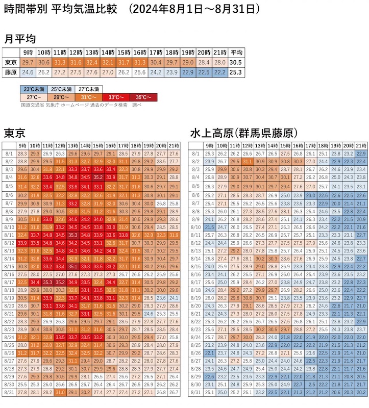 東京と水上高原(群馬県藤原)の平均気温差