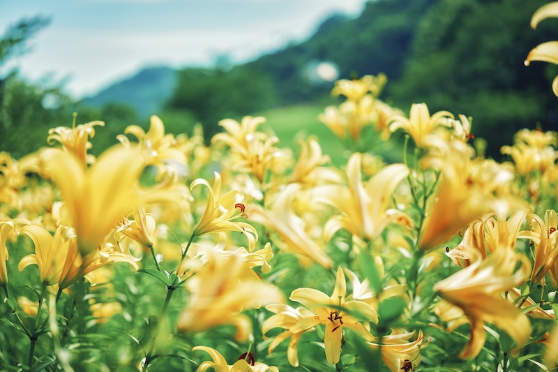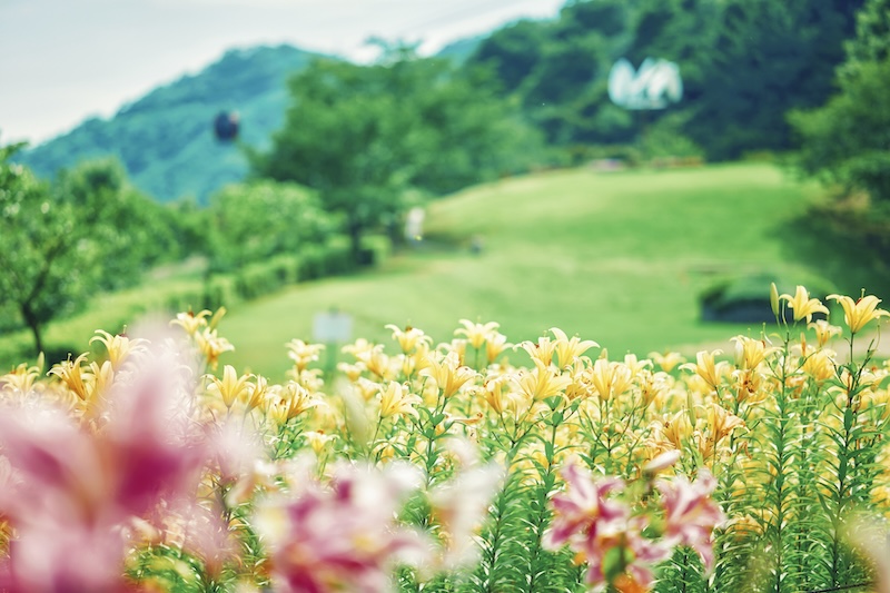 風の丘エリアのユリ園にある約1万球5万輪のユリが一面に咲き誇り、あたりは甘く気品あふれる香りに包まれます。園内では、様々なロケーションで凛としたユリの花姿をお楽しみいただけます