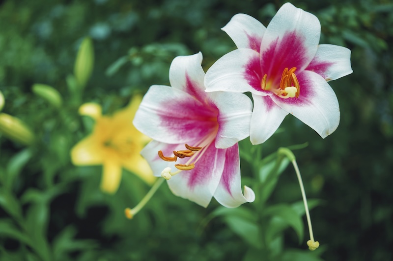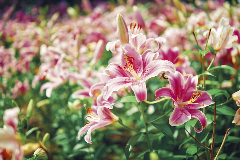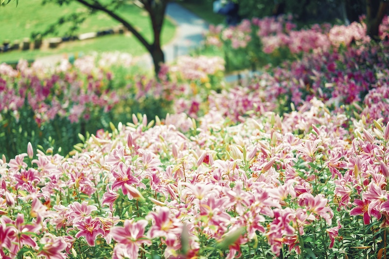 黄色、ピンク色の2種類のユリ(オリエンタルリリー)が一面に咲き誇ります