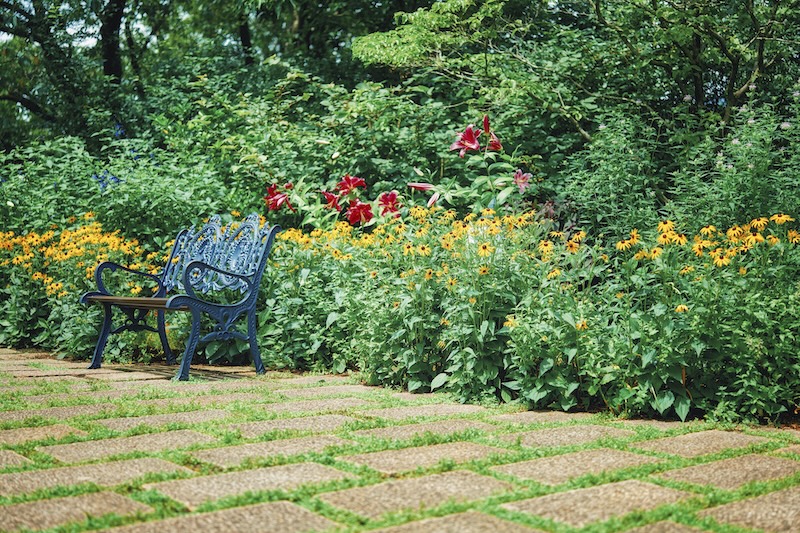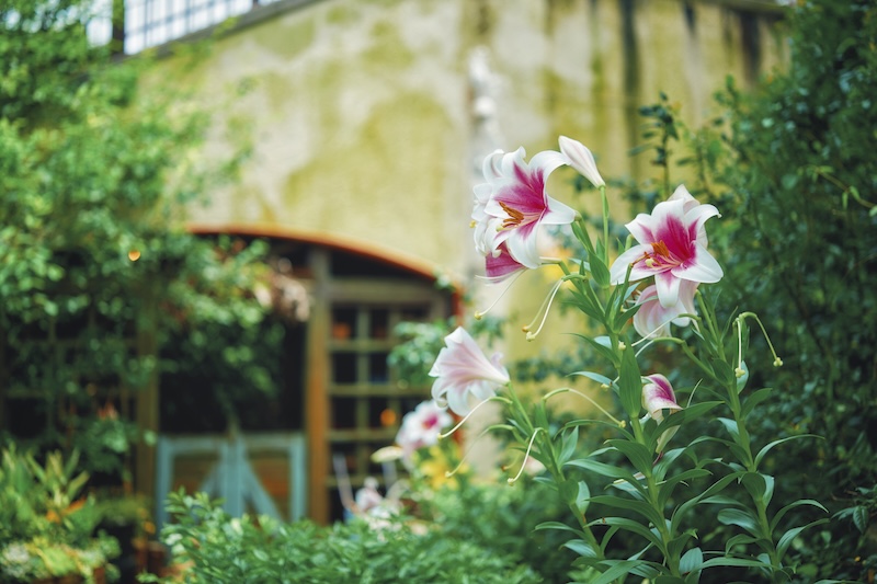 山並みを背景にヨーロッパの雰囲気が漂う香りと彩りに満ちたガーデン。足元の石畳を歩くと優しいミントの香りに包まれます。香りのある草花を中心に植栽したガーデンの中を彩る花々とハーブの優しい「色合い」、優雅なユリの「香り」を同時にお楽しみいただけます