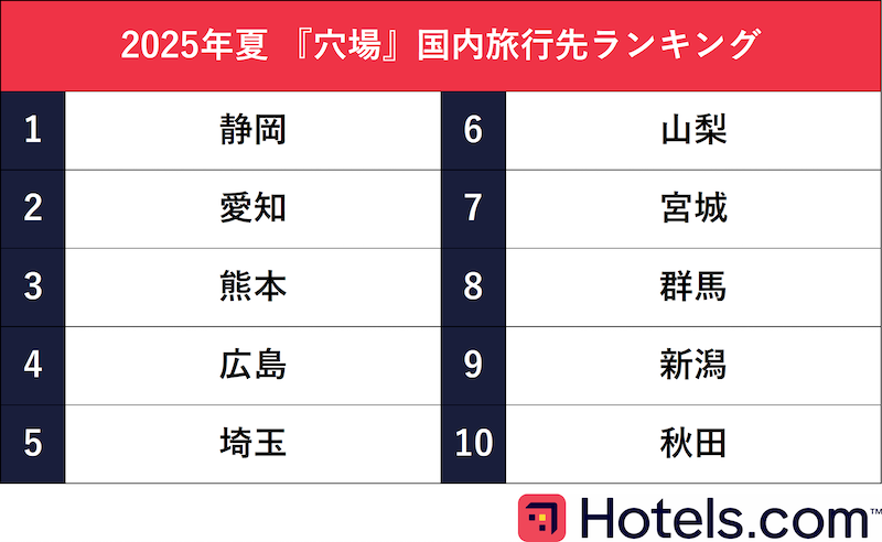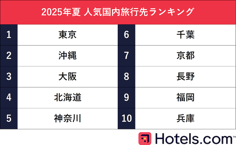 Hotels.com は、検索データから見た2025年夏の「人気国内旅行先ランキング」、「『穴場』国内旅行先ランキング」、「国内旅行のホテル選びの人気フィルター」、そして「お盆期間中のホテルの混雑予想日」を発表します。